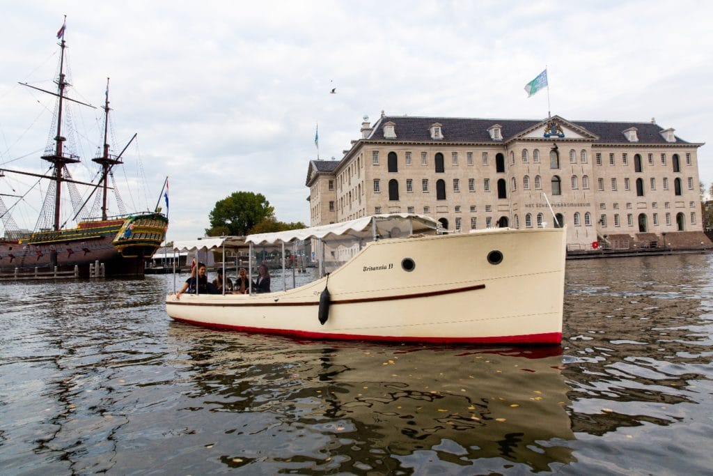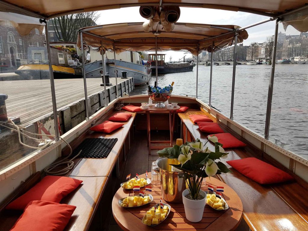 An enchanting illuminated Amsterdam, a beautiful ship and good company. The Saloonboat V is one of the smaller saloonboats that you can enjoy on the waters! If preferred, we could serve exquisite appetizers equipped with a good glass of wine, beer or soda. All this together ensures a very special day or evening for you and your guests!