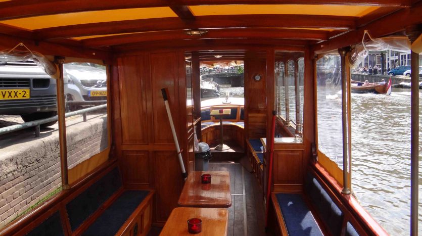 Salonboat XVIII was built in 1907 in one Hollands nothern provinces called “Groningen”. This beautiful boat has been in and around Amsterdam since 1999 and has been thoroughly restored during that period. The decor is luxurious; Upholstered sofas with royal blue velours and a warm teak finish. On board there is a bar, a toilet and a music system where you can connect your own iphone or ipod if preferred.